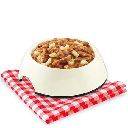 Stuzzy Shreds with Veal and Pasta for dogs is savoury, nourishing and… trendy! Natural ingredients slow-cooked into a complete meal that will be a feast for your dog.